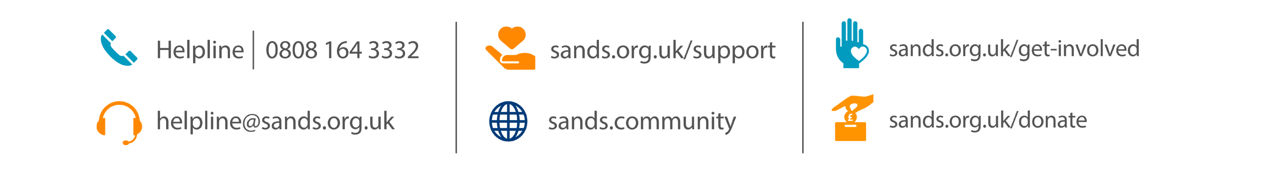 Sands (Stillbirth and Neonatal Death Society). Charity Registered in Scotland SC042789, England and Wales 299679. We also operate in Northern Ireland. Company Limited by Guarantee Number: 2212082. Registered Address: 10–18 Union Street, London, SE1 1SZ.